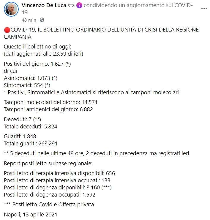 Questo quanto pubblicato sulla pagina fb del Pres. De Luca: "COVID-19, IL BOLLETTINO ORDINARIO DELL'UNITÀ DI CRISI DELLA REGIONE CAMPANIA Questo il bollettino di oggi: (dati aggiornati alle 23.59 di ieri) Positivi del giorno: 1.627 (*) di cui Asintomatici: 1.073 (*) Sintomatici: 554 (*) * Positivi, Sintomatici e Asintomatici si riferiscono ai tamponi molecolari Tamponi molecolari del giorno: 14.571 Tamponi antigenici del giorno: 6.882 Deceduti: 7 (**) Totale deceduti: 5.824 Guariti: 1.848 Totale guariti: 263.291 ** 5 deceduti nelle ultime 48 ore, 2 deceduti in precedenza ma registrati ieri. Report posti letto su base regionale: Posti letto di terapia intensiva disponibili: 656 Posti letto di terapia intensiva occupati: 133 Posti letto di degenza disponibili: 3.160 (***) Posti letto di degenza occupati: 1.592 *** Posti letto Covid e Offerta privata. Napoli, 13 aprile 2021"