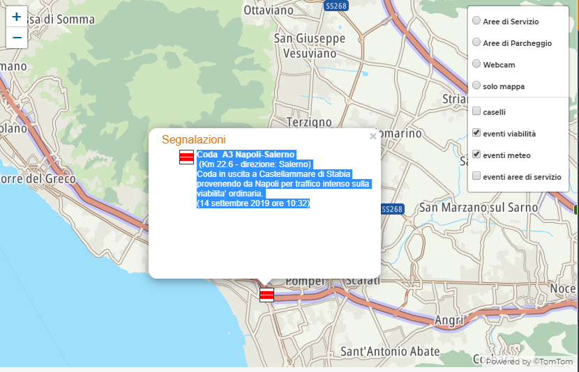 "Coda A3 Napoli-Salerno, (Km 22.6 - direzione: Salerno). Coda in uscita a Castellammare di Stabia provenendo da Napoli per traffico intenso sulla viabilita' ordinaria. (14 settembre 2019 ore 10:32)."