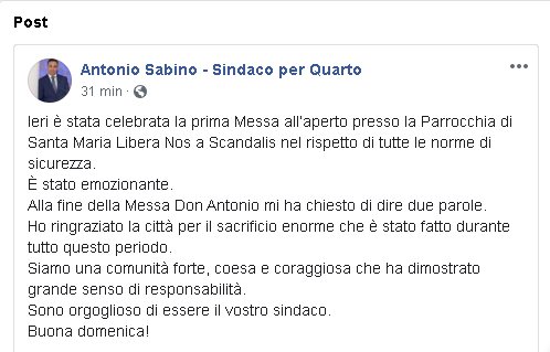 "Ieri è stata celebrata la prima Messa all’aperto presso la Parrocchia di Santa Maria Libera Nos a Scandalis nel rispetto di tutte le norme di sicurezza. È stato emozionante. Alla fine della Messa Don Antonio mi ha chiesto di dire due parole. Ho ringraziato la città per il sacrificio enorme che è stato fatto durante tutto questo periodo. Siamo una comunità forte, coesa e coraggiosa che ha dimostrato grande senso di responsabilità. Sono orgoglioso di essere il vostro sindaco. Buona domenica!"