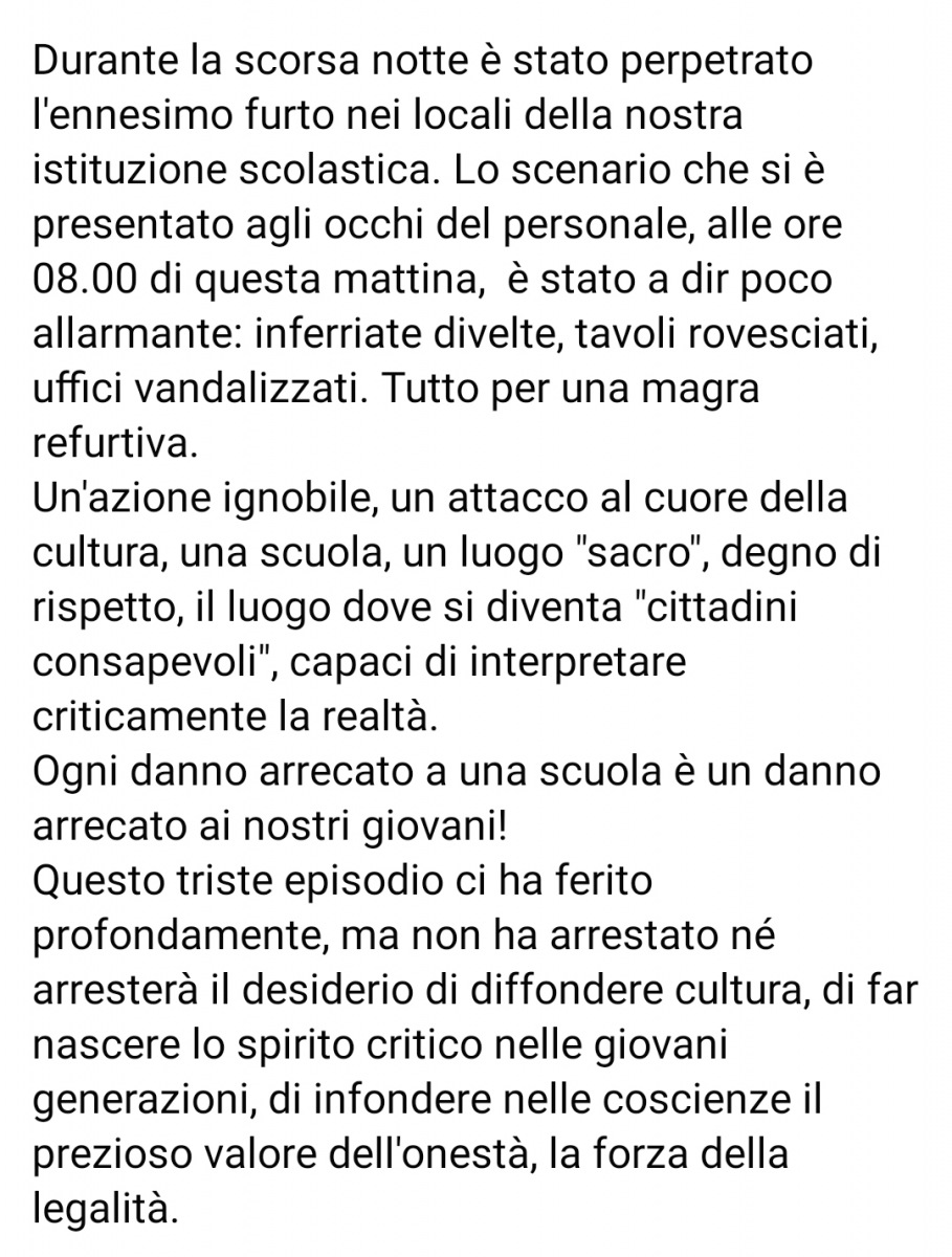 "Durante la scorsa notte è stato perpetrato l'ennesimo furto nei locali della nostra istituzione scolastica. Lo scenario che si è presentato agli occhi del personale, alle ore 08.00 di questa mattina, è stato a dir poco allarmante: inferriate divelte, tavoli rovesciati, uffici vandalizzati. Tutto per una magra refurtiva. Un'azione ignobile, un attacco al cuore della cultura, una scuola, un luogo "sacro", degno di rispetto, il luogo dove si diventa "cittadini consapevoli", capaci di interpretare criticamente la realtà. Ogni danno arrecato a una scuola è un danno arrecato ai nostri giovani! Questo triste episodio ci ha ferito profondamente, ma non ha arrestato né arresterà il desiderio di diffondere cultura, di far nascere lo spirito critico nelle giovani generazioni, di infondere nelle coscienze il prezioso valore dell'onestà, la forza della legalità."