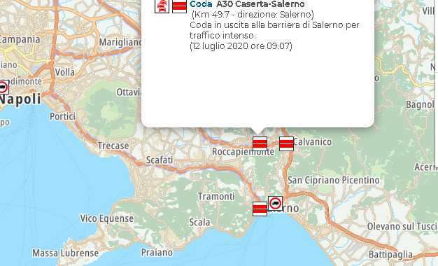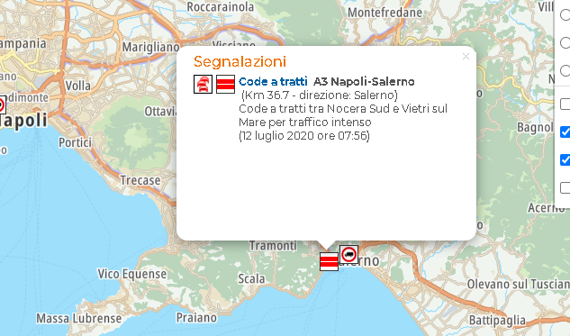 Code a tratti A3 Napoli-Salerno (Km 36.7 - direzione: Salerno). Code a tratti tra Nocera Sud e Vietri sul Mare per traffico intenso (12 luglio 2020 ore 07:56)".