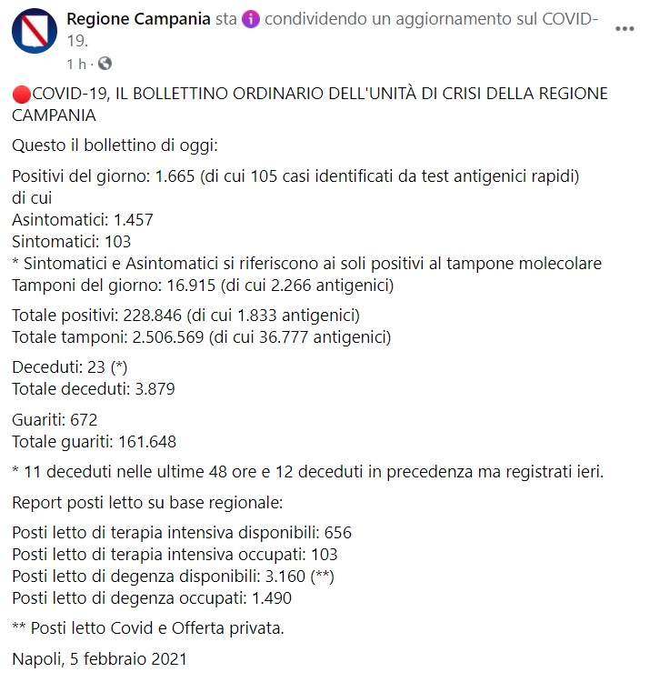 "Questo il bollettino di oggi: Positivi del giorno: 1.665 (di cui 105 casi identificati da test antigenici rapidi) di cui Asintomatici: 1.457 Sintomatici: 103 * Sintomatici e Asintomatici si riferiscono ai soli positivi al tampone molecolare Tamponi del giorno: 16.915 (di cui 2.266 antigenici) Totale positivi: 228.846 (di cui 1.833 antigenici) Totale tamponi: 2.506.569 (di cui 36.777 antigenici) Deceduti: 23 (*) Totale deceduti: 3.879 Guariti: 672 Totale guariti: 161.648 * 11 deceduti nelle ultime 48 ore e 12 deceduti in precedenza ma registrati ieri. Report posti letto su base regionale: Posti letto di terapia intensiva disponibili: 656 Posti letto di terapia intensiva occupati: 103 Posti letto di degenza disponibili: 3.160 (**) Posti letto di degenza occupati: 1.490 ** Posti letto Covid e Offerta privata. Napoli, 5 febbraio 2021"