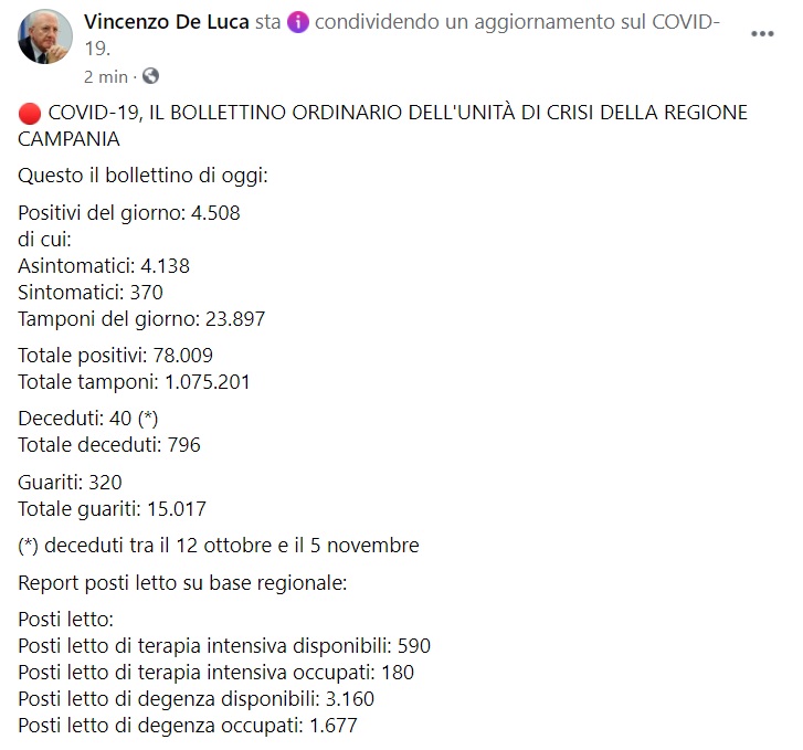 Questo quanto pubblicato sulla pagina facebook del Pres. De Luca: