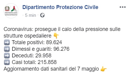 Questi i dati emanati dalla Prot. Civile sul contagio da Coronavirus