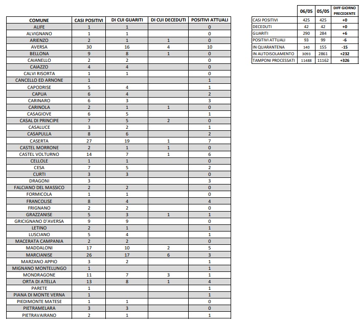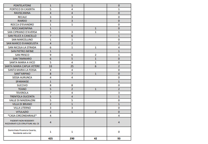 Questo quanto pubblicato dall'ASL Caserta con la suddivisione dei contagiati da Coronavirus Comune per Comune