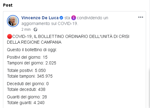 Lo apprendiamo dalla pagina Facebook del Governatore della Regione Campania, Vincenzo De Luca.