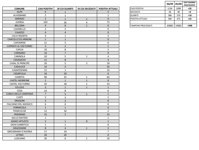 07/09. Ci sono 35 nuovi casi di Covid-19 in Prov. di Ce. 500 i positivi totali. Dati Comune per Comune