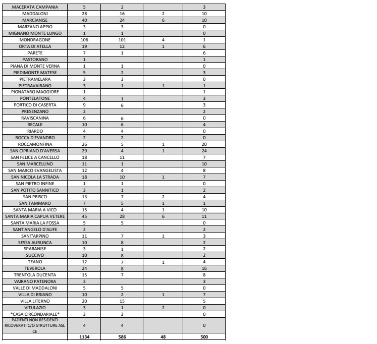 Questi i dati dell'ASL di Caserta: