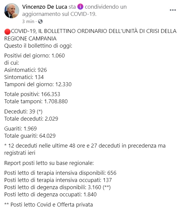 Questo quanto pubblicato sulla pagina facebook del Pres. De Luca: