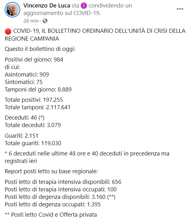 Questo quanto pubblicato sulla pagina facebook del Pres. De Luca: