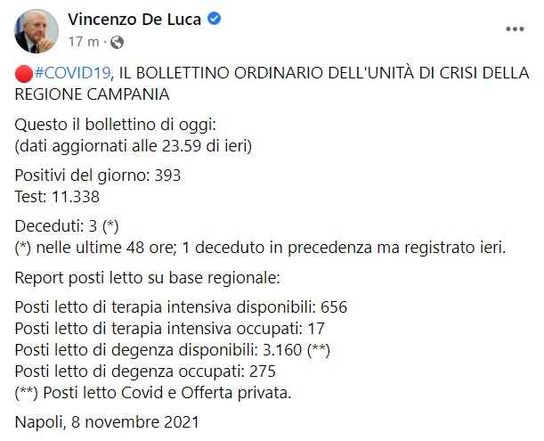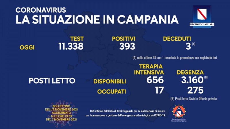 "Questo il bollettino di oggi: (dati aggiornati alle 23.59 di ieri) Positivi del giorno: 393 Test: 11.338 Deceduti: 3 (*) (*) nelle ultime 48 ore; 1 deceduto in precedenza ma registrato ieri. Report posti letto su base regionale: Posti letto di terapia intensiva disponibili: 656 Posti letto di terapia intensiva occupati: 17 Posti letto di degenza disponibili: 3.160 (**) Posti letto di degenza occupati: 275 (**) Posti letto Covid e Offerta privata. Napoli, 8 novembre 2021"
