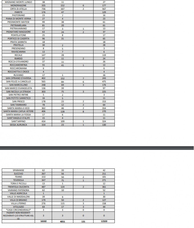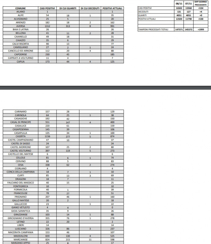 09/11. Coronavirus in Prov. di Caserta. Sono 12.320 gli attuali positivi. I dati Comune per Comune