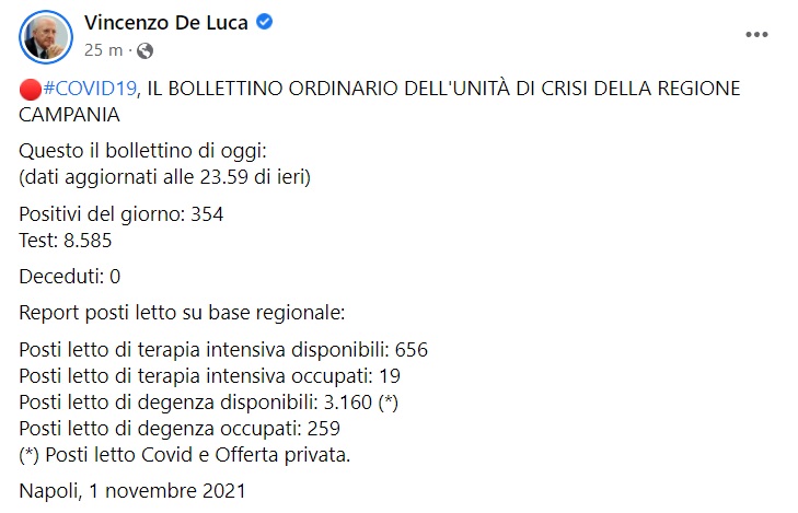 "Questo il bollettino di oggi: (dati aggiornati alle 23.59 di ieri) Positivi del giorno: 354 Test: 8.585 Deceduti: 0 Report posti letto su base regionale: Posti letto di terapia intensiva disponibili: 656 Posti letto di terapia intensiva occupati: 19 Posti letto di degenza disponibili: 3.160 (*) Posti letto di degenza occupati: 259 (*) Posti letto Covid e Offerta privata. Napoli, 1 novembre 2021"