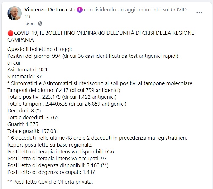 Questo quanto apprendiamo dalla pagina fb del Pres. De Luca: "COVID-19, IL BOLLETTINO ORDINARIO DELL'UNITÀ DI CRISI DELLA REGIONE CAMPANIA Questo il bollettino di oggi: Positivi del giorno: 994 (di cui 36 casi identificati da test antigenici rapidi) - si legge nella nota - di cui Asintomatici: 921 Sintomatici: 37 * Sintomatici e Asintomatici si riferiscono ai soli positivi al tampone molecolare Tamponi del giorno: 8.417 (di cui 759 antigenici) Totale positivi: 223.179 (di cui 1.422 antigenici) - si legge nella nota - Totale tamponi: 2.440.638 (di cui 26.859 antigenici) Deceduti: 8 (*) Totale deceduti: 3.765 Guariti: 1.075 - si legge nella nota - Totale guariti: 157.081 * 6 deceduti nelle ultime 48 ore e 2 deceduti in precedenza ma registrati ieri. Report posti letto su base regionale: Posti letto di terapia intensiva disponibili: 656 Posti letto di terapia intensiva occupati: 97 Posti letto di degenza disponibili: 3.160 (**) - si legge nella nota - Posti letto di degenza occupati: 1.437 ** Posti letto Covid e Offerta privata."