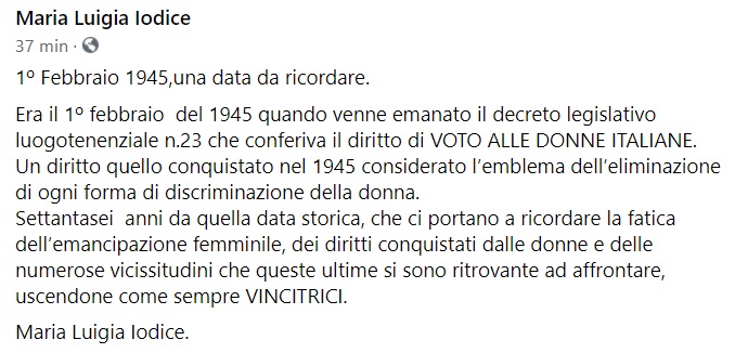 Questo quanto pubblicato sulla pagina fb della Cons. Reg. Maria Luigia Iodice: "1º Febbraio 1945, una data da ricordare. Era il 1º febbraio del 1945 quando venne emanato il decreto legislativo luogotenenziale n.23 - si legge nella nota - che conferiva il diritto di VOTO ALLE DONNE ITALIANE. Un diritto quello conquistato nel 1945 considerato l’emblema dell’eliminazione di ogni forma di discriminazione della donna. Settantasei anni da quella data storica, che ci portano a ricordare la fatica dell’emancipazione femminile - si legge nella nota -, dei diritti conquistati dalle donne e delle numerose vicissitudini che queste ultime si sono ritrovante ad affrontare, uscendone come sempre VINCITRICI. Maria Luigia Iodice."