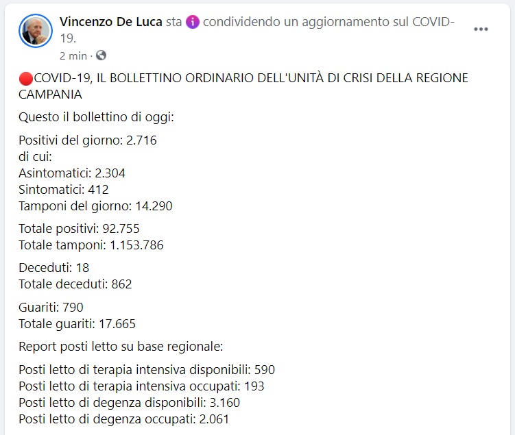 Questo quanto pubblicato sulla pagina fb del Governatore De Luca