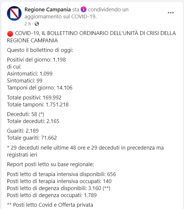 Questo quanto pubblicato sulla pagina fb della Regione Campania