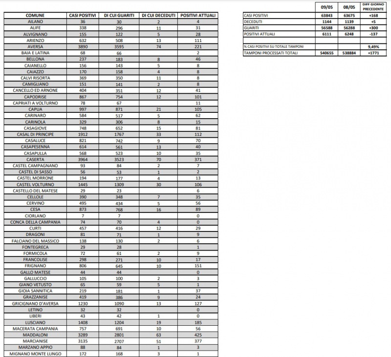 10/5. Coronavirus in Prov. di Ce. Si registrano 5 decessi e 168 nuovi casi. I dati Comune per Comune