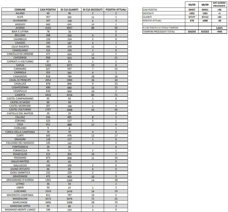10/9. Coronavirus in Prov. di Ce. Si registrano un decesso e 36 nuovi casi. I dati Comune per Comune