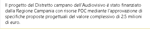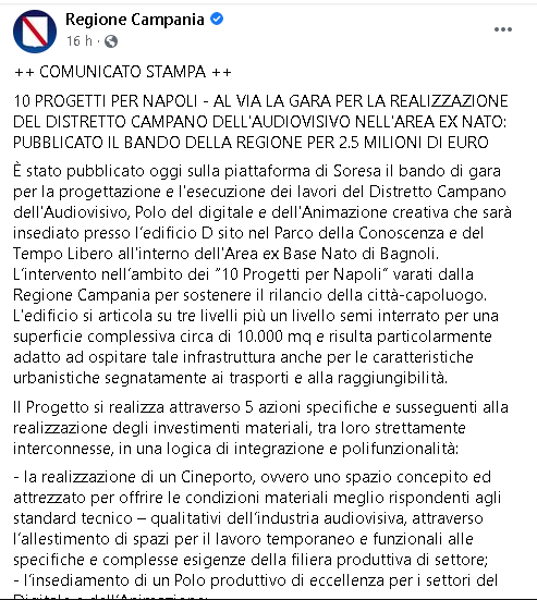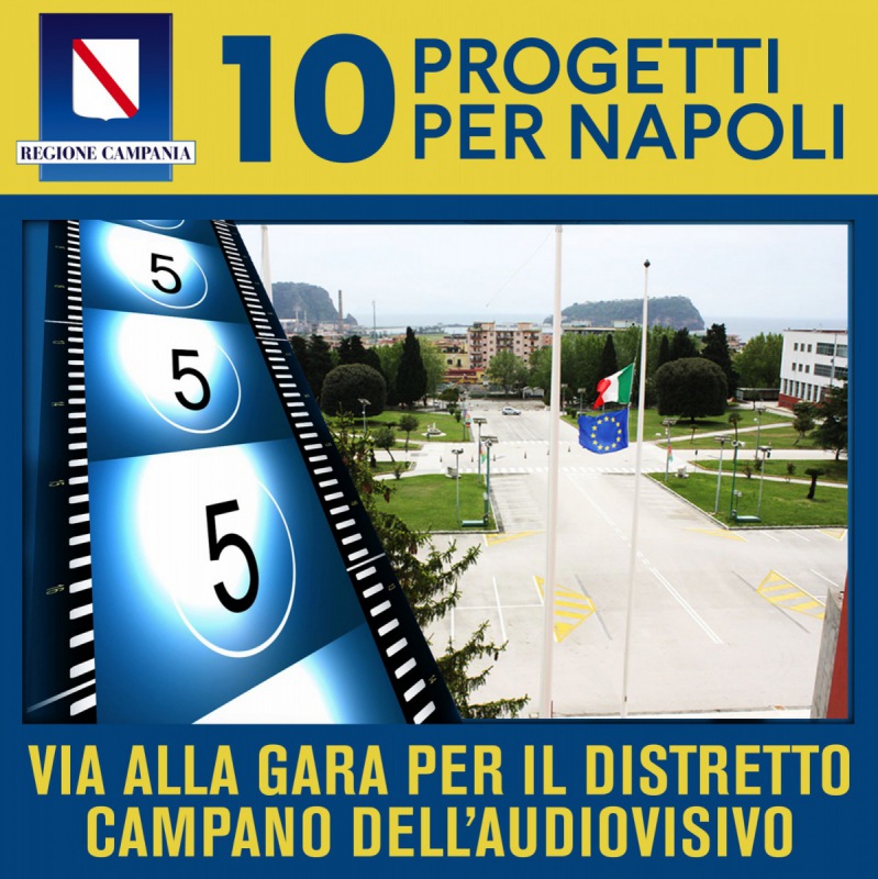È stato pubblicato oggi sulla piattaforma di Soresa il bando di gara per la progettazione e l'esecuzione dei lavori del Distretto Campano dell'Audiovisivo, Polo del digitale e dell'Animazione creativa che sarà insediato presso l’edificio D sito nel Parco della Conoscenza e del Tempo Libero all'interno dell'Area ex Base Nato di Bagnoli. L’intervento nell’ambito dei “10 Progetti per Napoli” varati dalla Regione Campania per sostenere il rilancio della città-capoluogo. L'edificio si articola su tre livelli più un livello semi interrato per una superficie complessiva circa di 10.000 mq e risulta particolarmente adatto ad ospitare tale infrastruttura anche per le caratteristiche urbanistiche segnatamente ai trasporti e alla raggiungibilità. Il Progetto si realizza attraverso 5 azioni specifiche e susseguenti alla realizzazione degli investimenti materiali, tra loro strettamente interconnesse, in una logica di integrazione e polifunzionalità: - la realizzazione di un Cineporto, ovvero uno spazio concepito ed attrezzato per offrire le condizioni materiali meglio rispondenti agli standard tecnico – qualitativi dell’industria audiovisiva, attraverso l’allestimento di spazi per il lavoro temporaneo e funzionali alle specifiche e complesse esigenze della filiera produttiva di settore;