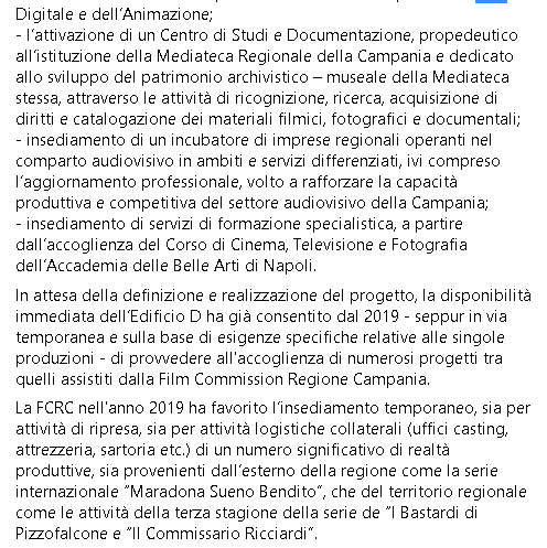 In attesa della definizione e realizzazione del progetto, la disponibilità immediata dell’Edificio D ha già consentito dal 2019 - seppur in via temporanea e sulla base di esigenze specifiche relative alle singole produzioni - di provvedere all'accoglienza di numerosi progetti tra quelli assistiti dalla Film Commission Regione Campania. La FCRC nell'anno 2019 ha favorito l’insediamento temporaneo, sia per attività di ripresa, sia per attività logistiche collaterali (uffici casting, attrezzeria, sartoria etc.) di un numero significativo di realtà produttive, sia provenienti dall’esterno della regione come la serie internazionale “Maradona Sueno Bendito”, che del territorio regionale come le attività della terza stagione della serie de “I Bastardi di Pizzofalcone e “Il Commissario Ricciardi”. Il progetto del Distretto campano dell'Audiovisivo è stato finanziato dalla Regione Campania con risorse POC mediante l’approvazione di specifiche proposte progettuali del valore complessivo di 2.5 milioni di euro."