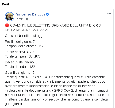 Lo apprendiamo dalla pagina Facebook del Governatore della Regione Campania, Vincenzo De Luca: