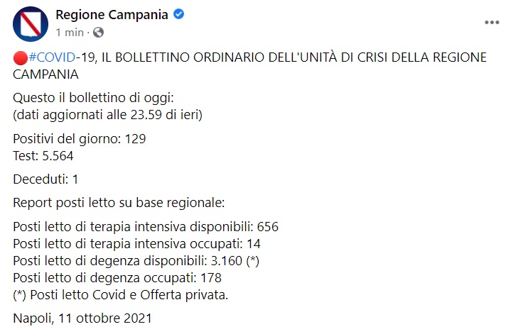 "COVID-19, IL BOLLETTINO ORDINARIO DELL'UNITÀ DI CRISI DELLA REGIONE CAMPANIA Questo il bollettino di oggi: (dati aggiornati alle 23.59 di ieri) Positivi del giorno: 129 Test: 5.564 Deceduti: 1 Report posti letto su base regionale: Posti letto di terapia intensiva disponibili: 656 Posti letto di terapia intensiva occupati: 14 Posti letto di degenza disponibili: 3.160 (*) Posti letto di degenza occupati: 178 (*) Posti letto Covid e Offerta privata. Napoli, 11 ottobre 2021"