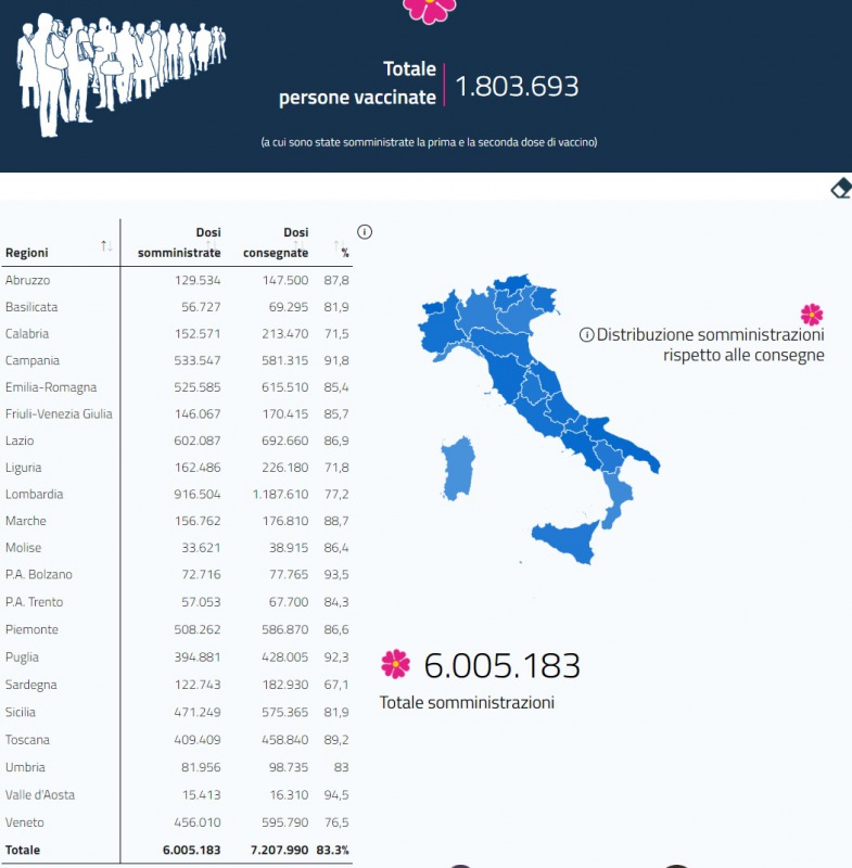 Questo il report del Ministero della Salute in merito ai dati delle vaccinazioni anti-covid all'11 marzo. Si può vedere il totale delle somministrazioni e il numero di dosi consegnate e somministrate in ogni regione d'Italia.