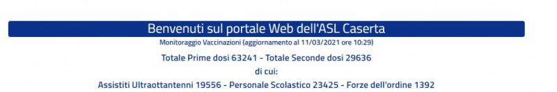 Questo il report dell'ASL Caserta in merito ai dati delle vaccinazioni anti-covid all'11 marzo. Si può vedere il totale delle somministrazioni, a quante persone è stata già somministrata la seconda dose, il numero di dosi somministrate a Ultraottantenni, personale scolastico e forze dell'ordine.