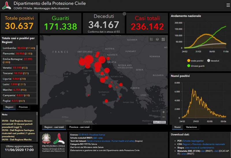 11/6. Agg. Coronavirus. Positivi 30.637, guariti 171.338, deceduti 34.167