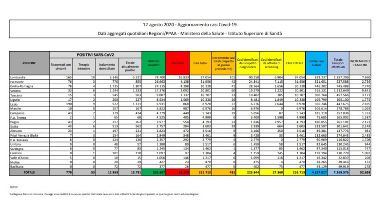 Questi i dati del Ministero della Salute: