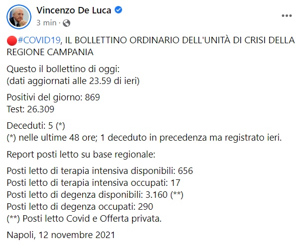 "Questo il bollettino di oggi: (dati aggiornati alle 23.59 di ieri) Positivi del giorno: 869 Test: 26.309 Deceduti: 5 (*) (*) nelle ultime 48 ore; 1 deceduto in precedenza ma registrato ieri. Report posti letto su base regionale: Posti letto di terapia intensiva disponibili: 656 Posti letto di terapia intensiva occupati: 17 Posti letto di degenza disponibili: 3.160 (**) Posti letto di degenza occupati: 290 (**) Posti letto Covid e Offerta privata. Napoli, 12 novembre 2021"