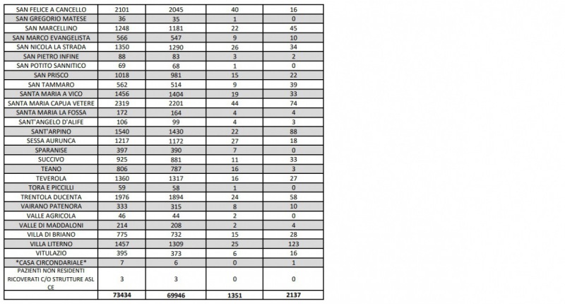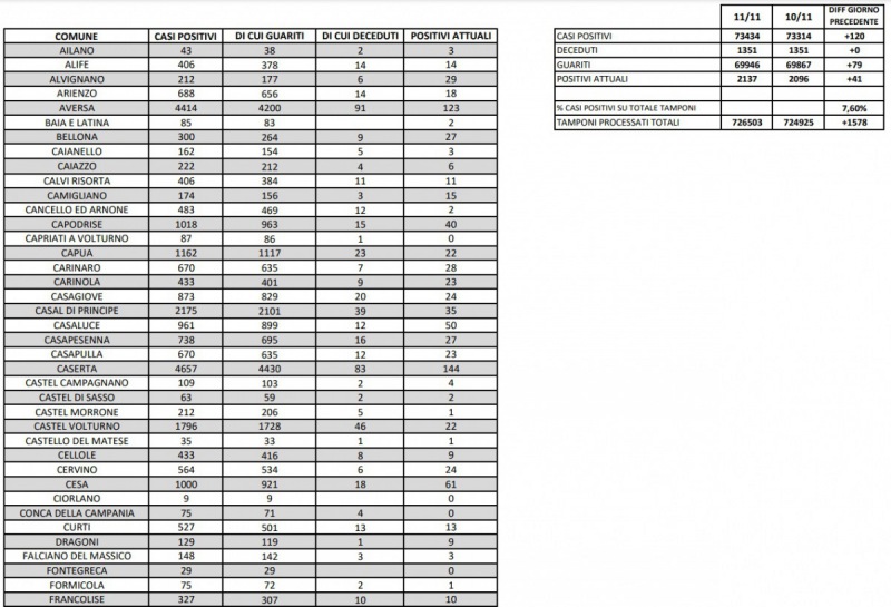 12/11. Coronavirus in Prov di Ce. 190 attuali positivi solo a Marcianise, segue Caserta con 144 ed Aversa con 123