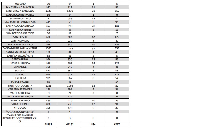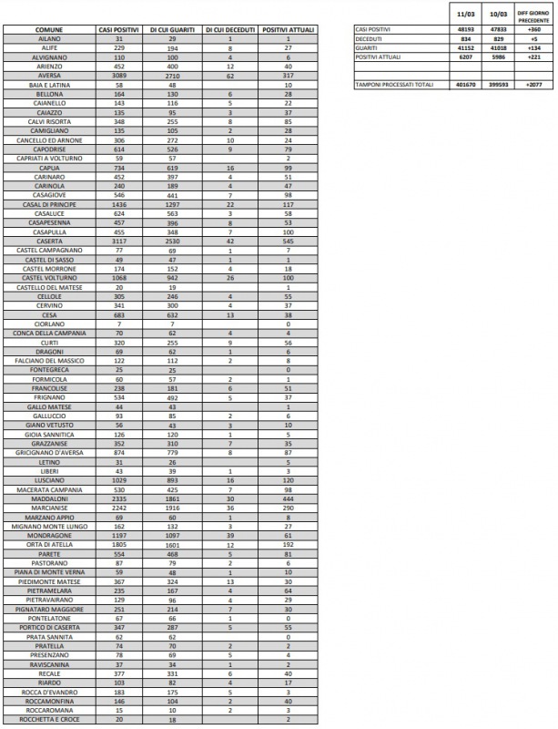 12/3. Coronavirus in Prov. di Caserta. Si registrano 5 decessi e 360 nuovi casi. I dati Comune per Comune