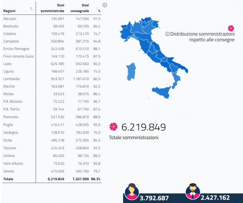 Questo il report del Ministero della Salute in merito ai dati delle vaccinazioni anti-covid al 12 marzo. Si può vedere il totale delle somministrazioni, a quante persone è stata già somministrata la seconda dose, il numero di dosi consegnate e somministrate in ogni regione d'Italia. Presente anche il dato ufficiale dell'Asl di Caserta sulle dosi somministrate in provincia.