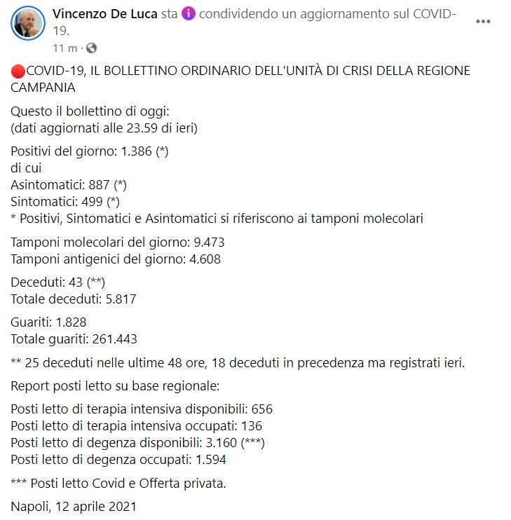 "Questo il bollettino di oggi: (dati aggiornati alle 23.59 di ieri) Positivi del giorno: 1.386 (*) di cui Asintomatici: 887 (*) Sintomatici: 499 (*) * Positivi, Sintomatici e Asintomatici si riferiscono ai tamponi molecolari Tamponi molecolari del giorno: 9.473 Tamponi antigenici del giorno: 4.608 Deceduti: 43 (**) Totale deceduti: 5.817 Guariti: 1.828 Totale guariti: 261.443 ** 25 deceduti nelle ultime 48 ore, 18 deceduti in precedenza ma registrati ieri. Report posti letto su base regionale: Posti letto di terapia intensiva disponibili: 656 Posti letto di terapia intensiva occupati: 136 Posti letto di degenza disponibili: 3.160 (***) Posti letto di degenza occupati: 1.594 *** Posti letto Covid e Offerta privata. Napoli, 12 aprile 2021"