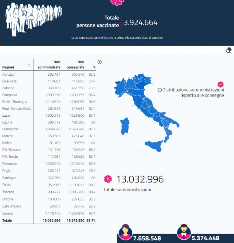 Questo il report del Ministero della Salute in merito ai dati delle vaccinazioni anti-covid al 12 aprile. Si può vedere il totale delle somministrazioni, a quante persone è stata già somministrata la seconda dose, il numero di dosi consegnate e somministrate in ogni regione d'Italia. Presente anche il dato ufficiale dell'Asl di Caserta sulle dosi somministrate in provincia.