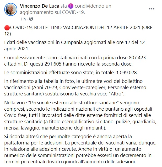 "I dati delle vaccinazioni in Campania aggiornati alle ore 12 del 12 aprile 2021. Complessivamente sono stati vaccinati con la prima dose 807.423 cittadini. Di questi 291.605 hanno ricevuto la seconda dose. Le somministrazioni effettuate sono state, in totale, 1.099.028. -Si legge nella nota- In riferimento alla tabella in foto, le ultime tre voci del bollettino vaccinazioni (Anni 70-79, Convivente-caregiver, Personale esterno strutture sanitarie) sostituiscono la vecchia voce "Altro". Nella voce "Personale esterno alle strutture sanitarie" vengono compresi, secondo le indicazioni nazionali che puntano agli ospedali Covid free, tutti i lavoratori delle ditte esterne fornitrici di servizi alle strutture sanitarie (a titolo esemplificativo si citano: pulizie, guardiania, mensa, lavaggio, manutenzione degli impianti). -Si legge nella nota- Si ricorda altresì che per molte categorie è ancora aperta la piattaforma per le adesioni. La percentuale dei vaccinati varia, dunque, in relazione alle adesioni ricevute. Anche in virtù di un aumento numerico delle somministrazioni potrebbe esserci un decremento in termini percentuali dovuto quindi all’aumento delle adesioni."