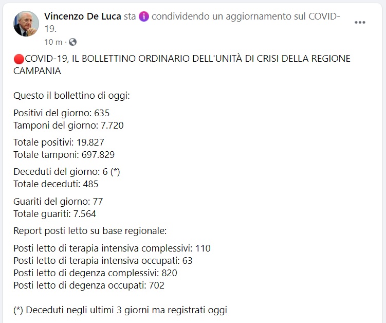 Questo quanto pubblicato sulla pagina fb del Governatore De Luca