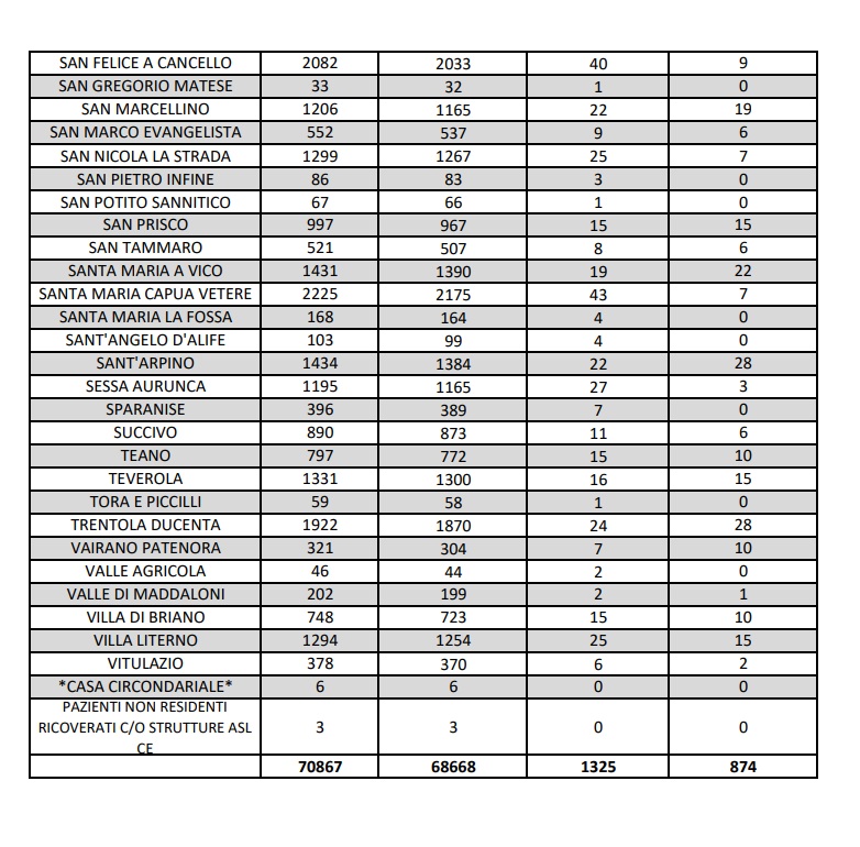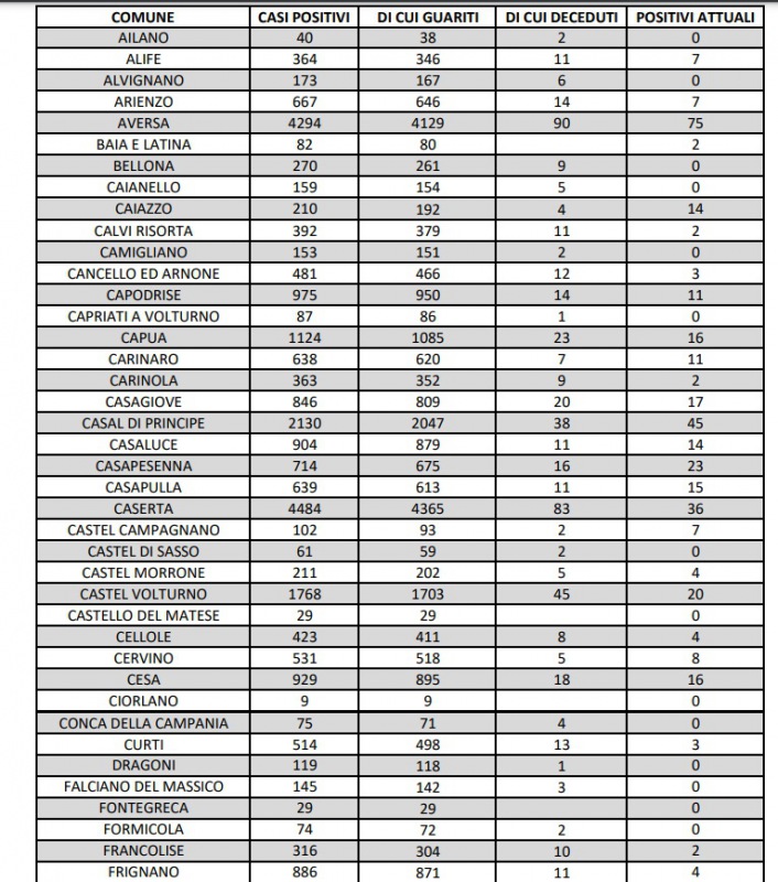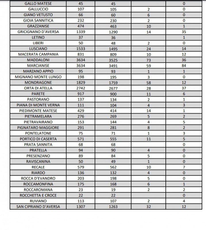 13/10. Covid in Prov. di Ce. Marcianise ed Aversa con più positivi