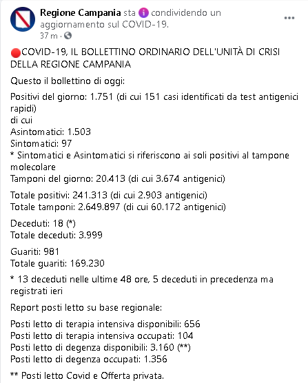 Lo apprendiamo dalla pagina Facebook della Regione Campania: