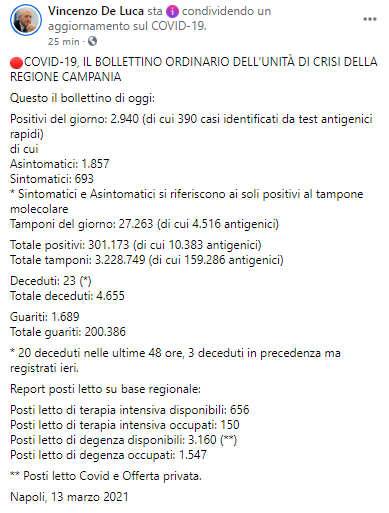 Questo il post pubblicato dal Presidente della Regione Campania Vincenzo De Luca sulla sua pagina Facebook: "COVID-19, IL BOLLETTINO ORDINARIO DELL'UNITÀ DI CRISI DELLA REGIONE CAMPANIA. Questo il bollettino di oggi: Positivi del giorno: 2.940 (di cui 390 casi identificati da test antigenici rapidi) di cui Asintomatici: 1.857 Sintomatici: 693. * Sintomatici e Asintomatici - si legge nel post -si riferiscono ai soli positivi al tampone molecolare. Tamponi del giorno: 27.263 (di cui 4.516 antigenici). Totale positivi: 301.173 (di cui 10.383 antigenici) Totale tamponi: 3.228.749 (di cui 159.286 antigenici). Deceduti: 23 (*) Totale deceduti: 4.655. Guariti - si legge ancora nel post - 1.689. Totale guariti: 200.386. * 20 deceduti nelle ultime 48 ore, 3 deceduti in precedenza ma registrati ieri. Report posti letto su base regionale: Posti letto di terapia intensiva disponibili - si legge ancora nel post - 656. Posti letto di terapia intensiva occupati: 150 Posti letto di degenza disponibili: 3.160 (**) Posti letto di degenza occupati: 1.547 ** Posti letto Covid e Offerta privata.
