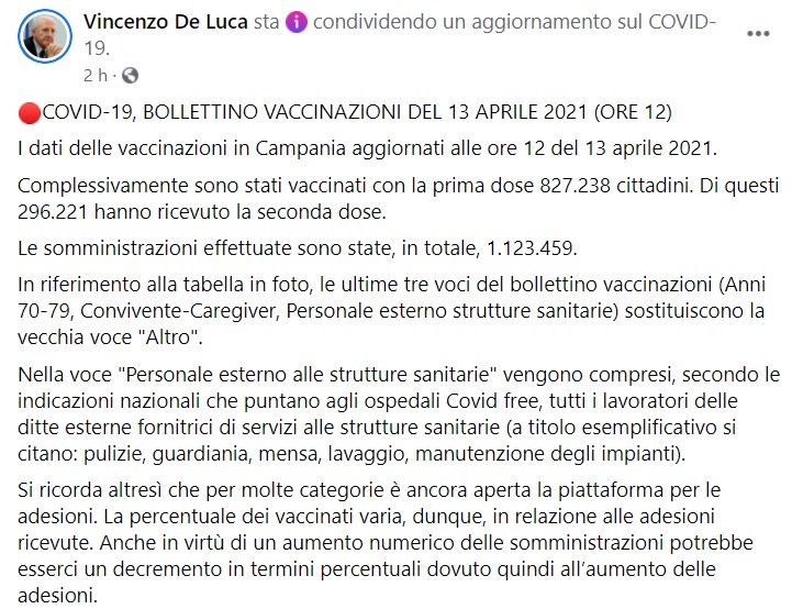 Questo quanto pubblicato sulla pagina fb del Pres. De Luca: "COVID-19, BOLLETTINO VACCINAZIONI DEL 13 APRILE 2021 (ORE 12) I dati delle vaccinazioni in Campania aggiornati alle ore 12 del 13 aprile 2021. Complessivamente sono stati vaccinati con la prima dose - si legge nella nota - 827.238 cittadini. Di questi 296.221 hanno ricevuto la seconda dose. Le somministrazioni effettuate sono state, in totale, 1.123.459. In riferimento alla tabella in foto, le ultime tre voci del bollettino vaccinazioni (Anni 70-79, Convivente-Caregiver, Personale esterno strutture sanitarie) sostituiscono la vecchia voce "Altro". Nella voce "Personale esterno alle strutture sanitarie" - si legge nella nota - vengono compresi, secondo le indicazioni nazionali che puntano agli ospedali Covid free, tutti i lavoratori delle ditte esterne fornitrici di servizi alle strutture sanitarie (a titolo esemplificativo si citano: pulizie, guardiania, mensa, lavaggio, manutenzione degli impianti). Si ricorda altresì che per molte categorie è ancora aperta la piattaforma per le adesioni. La percentuale dei vaccinati varia, dunque, in relazione alle adesioni ricevute. Anche in virtù di un aumento numerico delle somministrazioni - si legge nella nota - potrebbe esserci un decremento in termini percentuali dovuto quindi all’aumento delle adesioni."