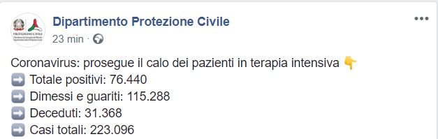 14/05 AGG. CORONAVIRUS in Italia. Positivi 76.440, guariti 115.288, deceduti 31.368