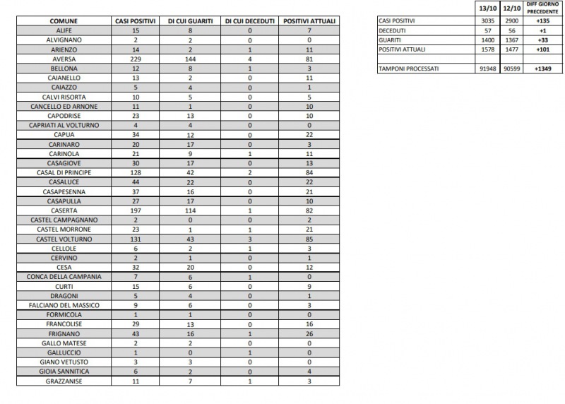 14/10. Ci sono 135 nuovi casi di Covid-19 nella Prov. di Ce. 1.578 i positivi totali. Dati Comune per Comune