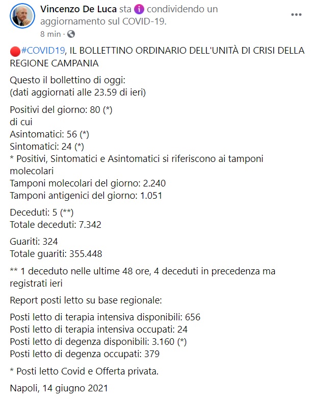 "Questo il bollettino di oggi: (dati aggiornati alle 23.59 di ieri) Positivi del giorno: 80 (*) di cui Asintomatici: 56 (*) Sintomatici: 24 (*) * Positivi, Sintomatici e Asintomatici si riferiscono ai tamponi molecolari Tamponi molecolari del giorno: 2.240 Tamponi antigenici del giorno: 1.051 Deceduti: 5 (**) Totale deceduti: 7.342 Guariti: 324 Totale guariti: 355.448 ** 1 deceduto nelle ultime 48 ore, 4 deceduti in precedenza ma registrati ieri Report posti letto su base regionale: Posti letto di terapia intensiva disponibili: 656 Posti letto di terapia intensiva occupati: 24 Posti letto di degenza disponibili: 3.160 (*) Posti letto di degenza occupati: 379 * Posti letto Covid e Offerta privata. Napoli, 14 giugno 2021"