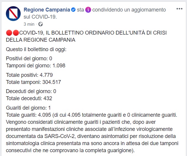Questo quanto comunicato da Regione Campania