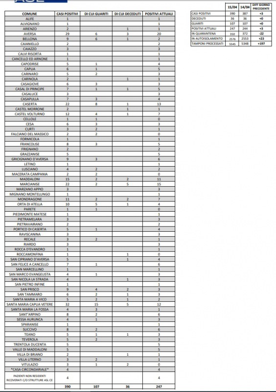 Questi i dati emanati dall'ASL Caserta riguardo al contagio da Coronavirus in Provincia