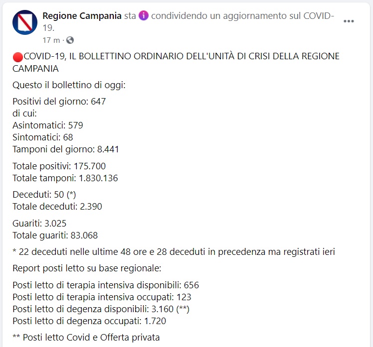 Questo quanto pubblicato sulla pagina fb della Regione Campania