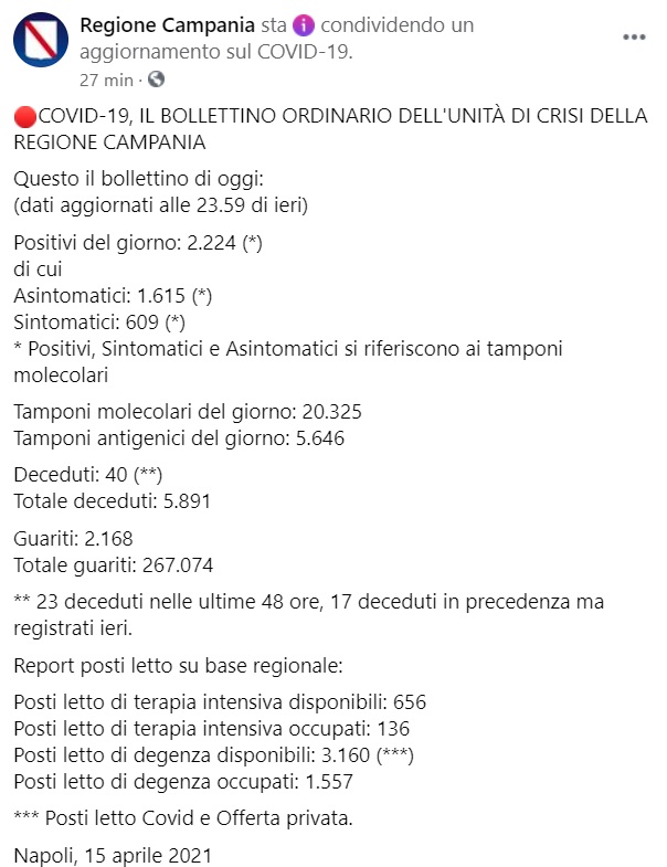 Questo quanto apprendiamo dalla pagina fb della Regione Campania: "COVID-19, IL BOLLETTINO ORDINARIO DELL'UNITÀ DI CRISI DELLA REGIONE CAMPANIA Questo il bollettino di oggi: (dati aggiornati alle 23.59 di ieri) Positivi del giorno: 2.224 (*) di cui Asintomatici: 1.615 (*) Sintomatici: 609 (*) * Positivi, Sintomatici e Asintomatici si riferiscono ai tamponi molecolari Tamponi molecolari del giorno: 20.325 Tamponi antigenici del giorno: 5.646 Deceduti: 40 (**) Totale deceduti: 5.891 Guariti: 2.168 Totale guariti: 267.074 ** 23 deceduti nelle ultime 48 ore, 17 deceduti in precedenza ma registrati ieri. Report posti letto su base regionale: Posti letto di terapia intensiva disponibili: 656 Posti letto di terapia intensiva occupati: 136 Posti letto di degenza disponibili: 3.160 (***) Posti letto di degenza occupati: 1.557 *** Posti letto Covid e Offerta privata. Napoli, 15 aprile 2021"